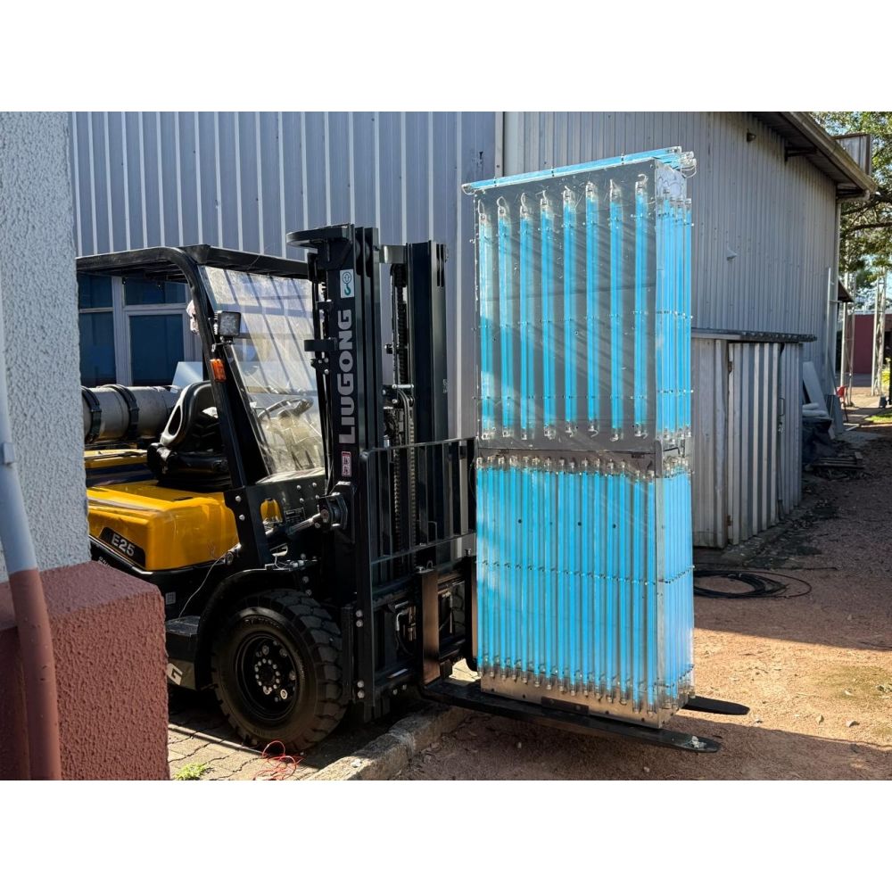 Combinando engenharia pesada e tecnologia avançada, o Huttech Torre é acoplado a uma empilhadeira LiuGong, garantindo mobilidade, estabilidade e alcance vertical superior, permitindo tratamentos de áreas extensas em poucos minutos.